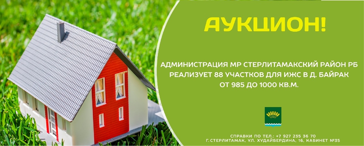 В целях индивидуального жилищного строительства Администрация МР Стерлитамакский район РБ реализует участки в д. Байрак площадью от 985 до 1000 кв. метров. Кадастровые номера реализуемых 88 участков: 02:44:211001:2228 - 02:44:211001:2315. Срок приема заявок - с 30 октября по 30 ноября. При совершении купли-продажи и оформлении земельного участка гарантирована прозрачность и чистота сделки с юридической точки зрения.