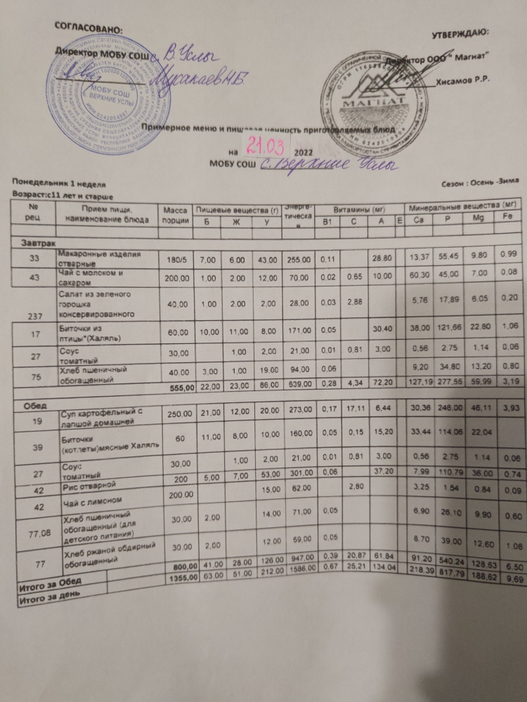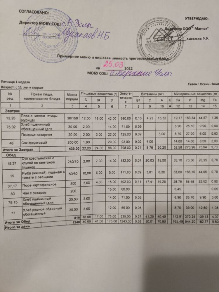 Стоимость школьного питания