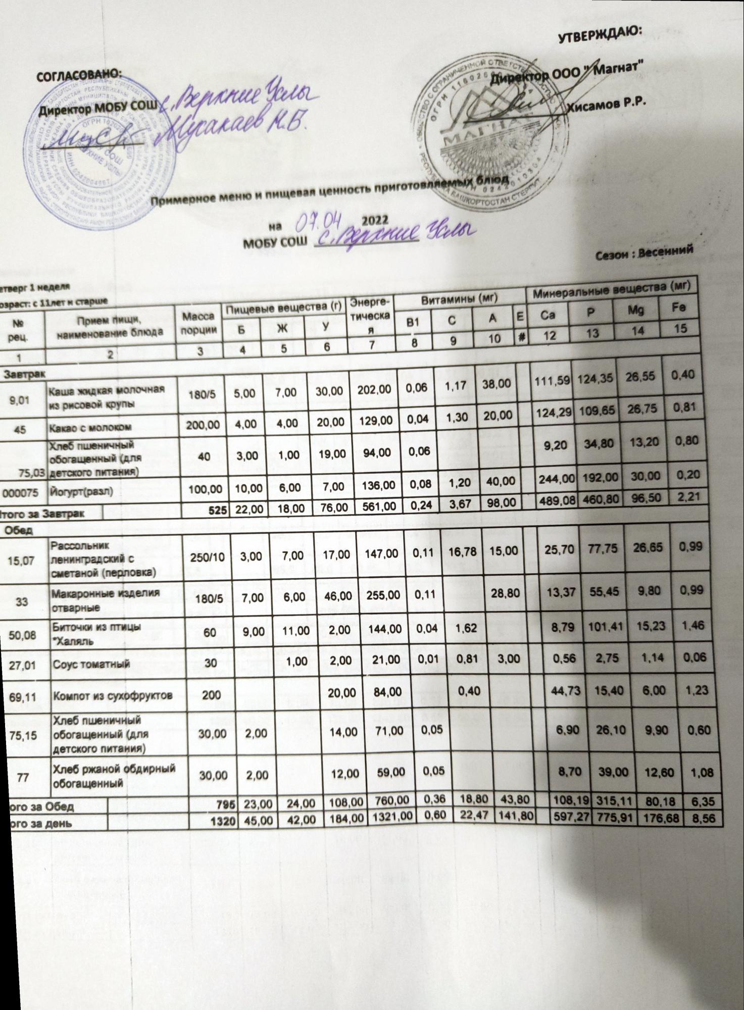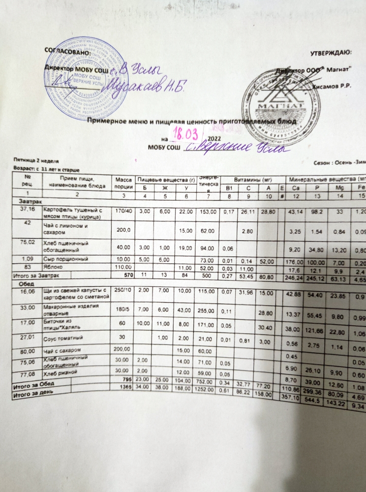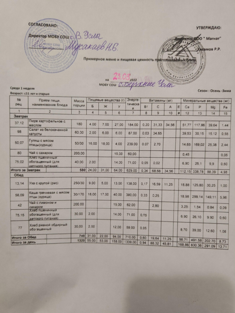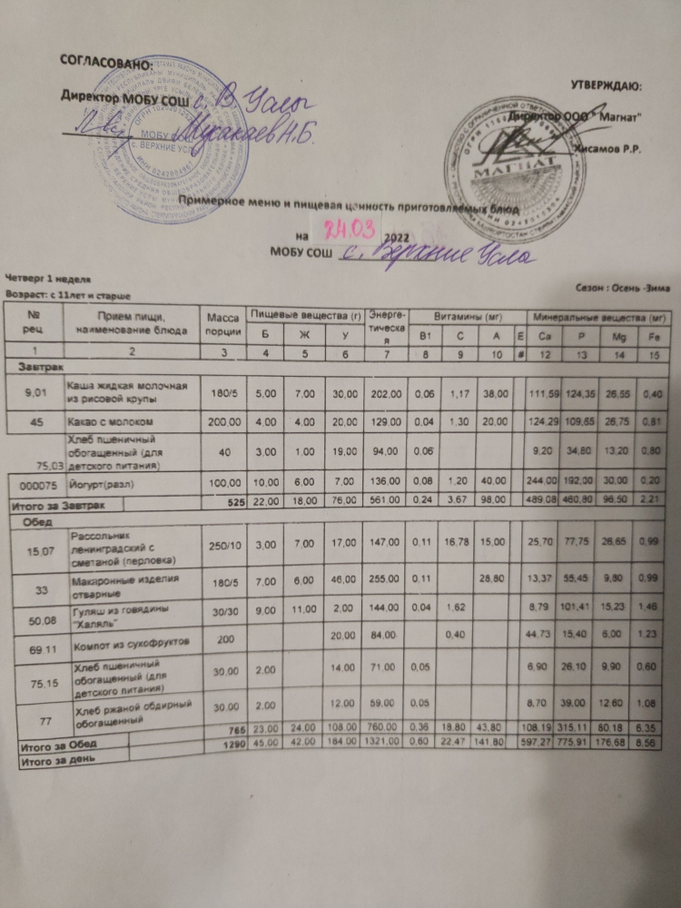 Меню дошкольной группы