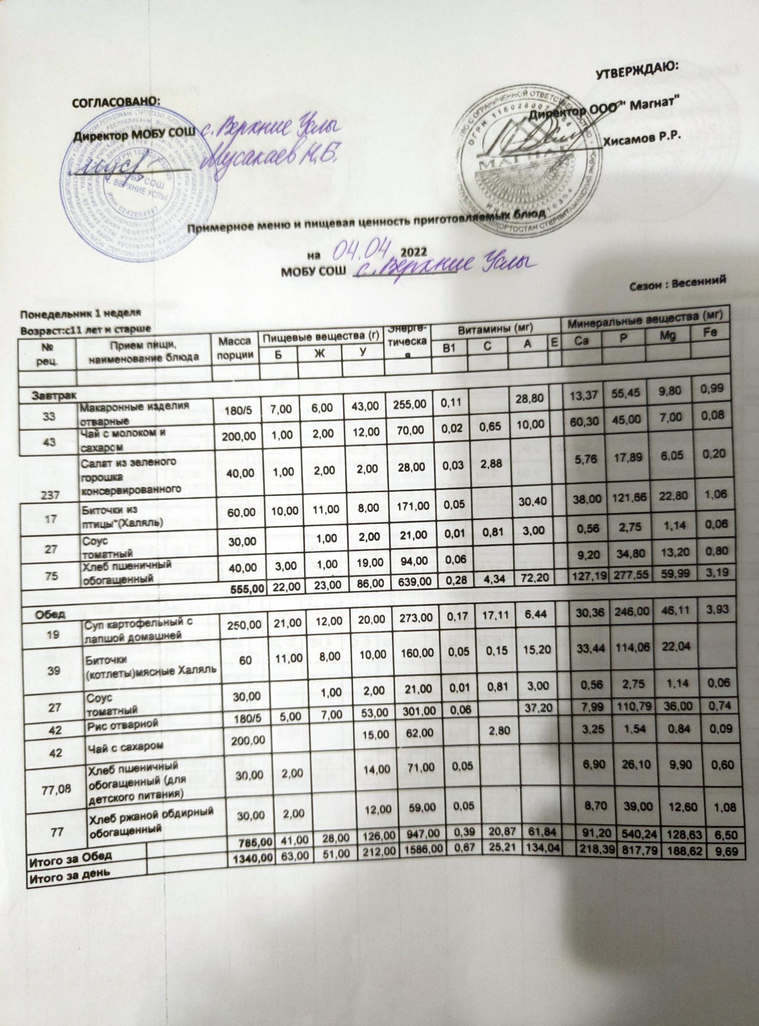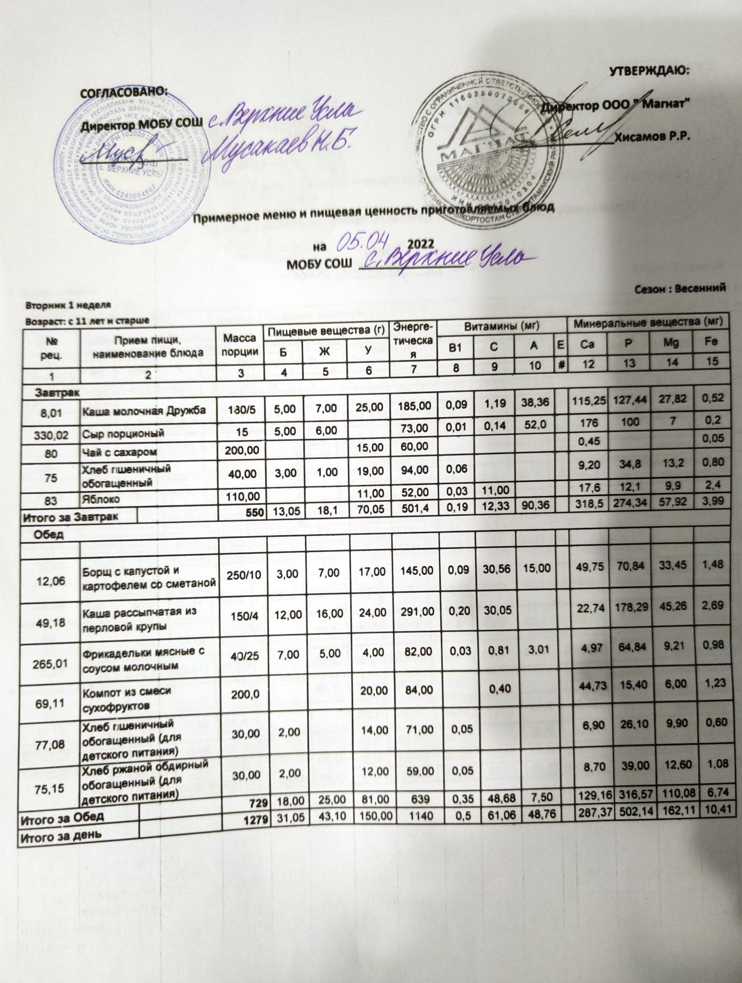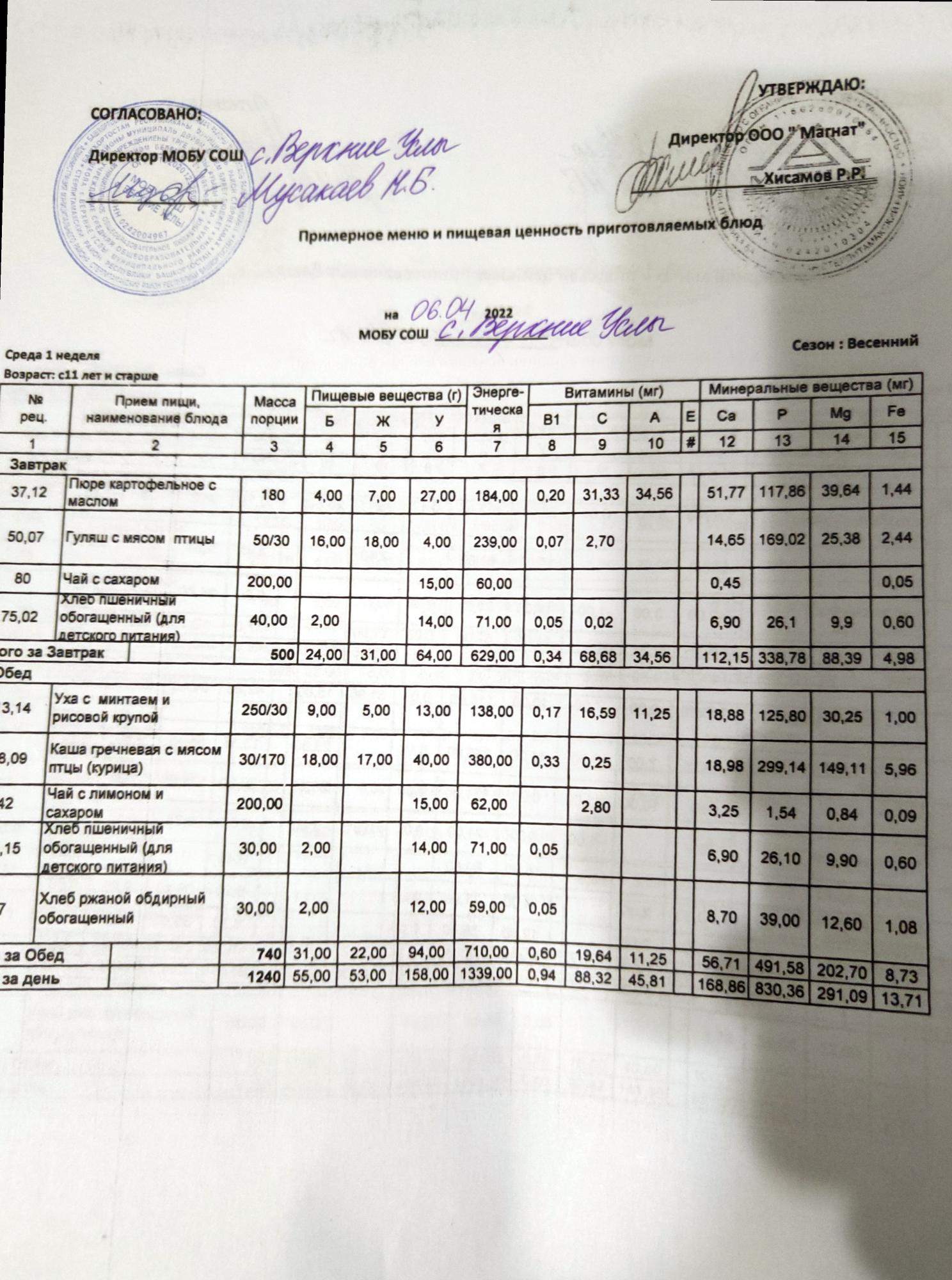 Меню дошкольной группы