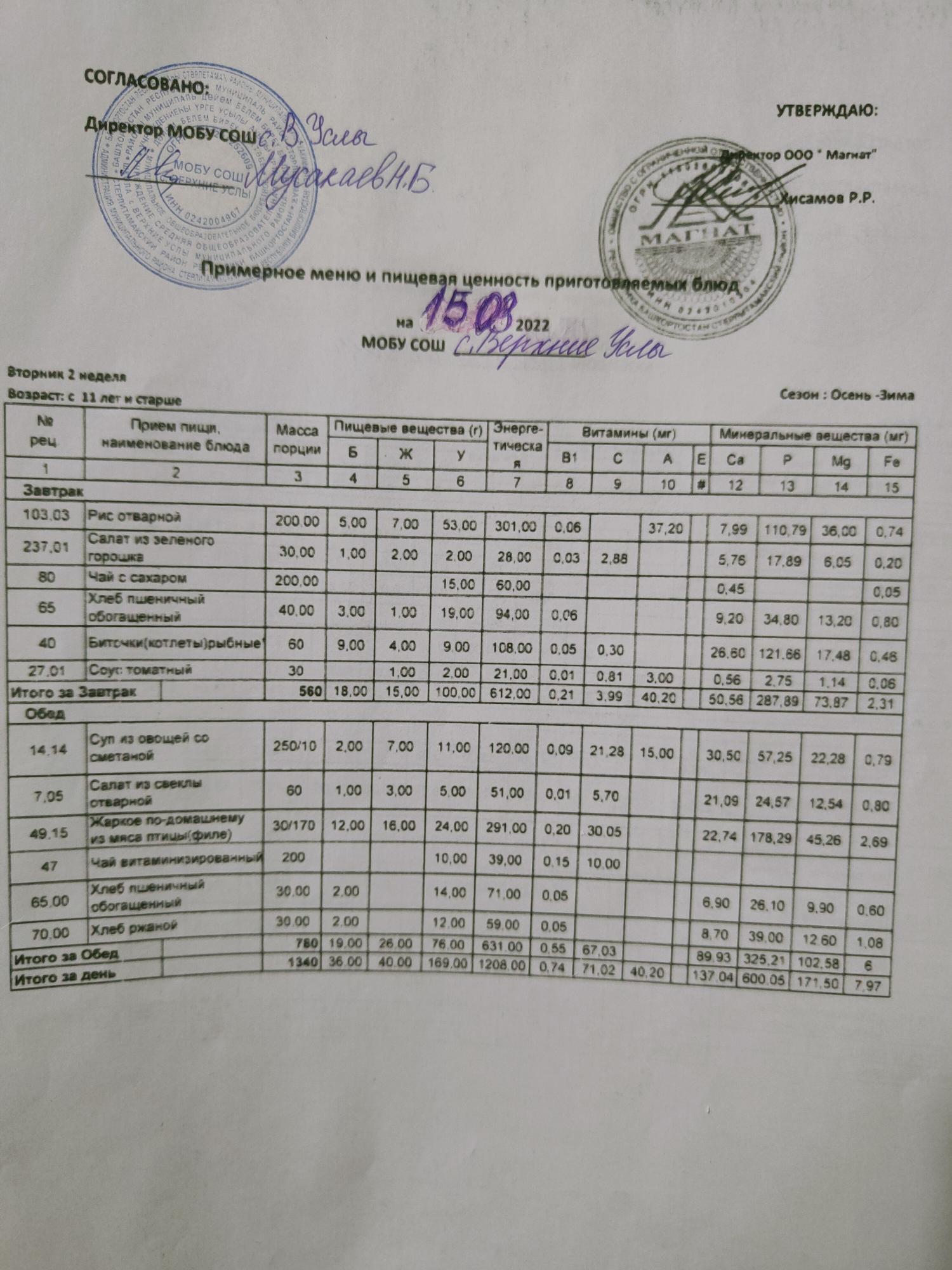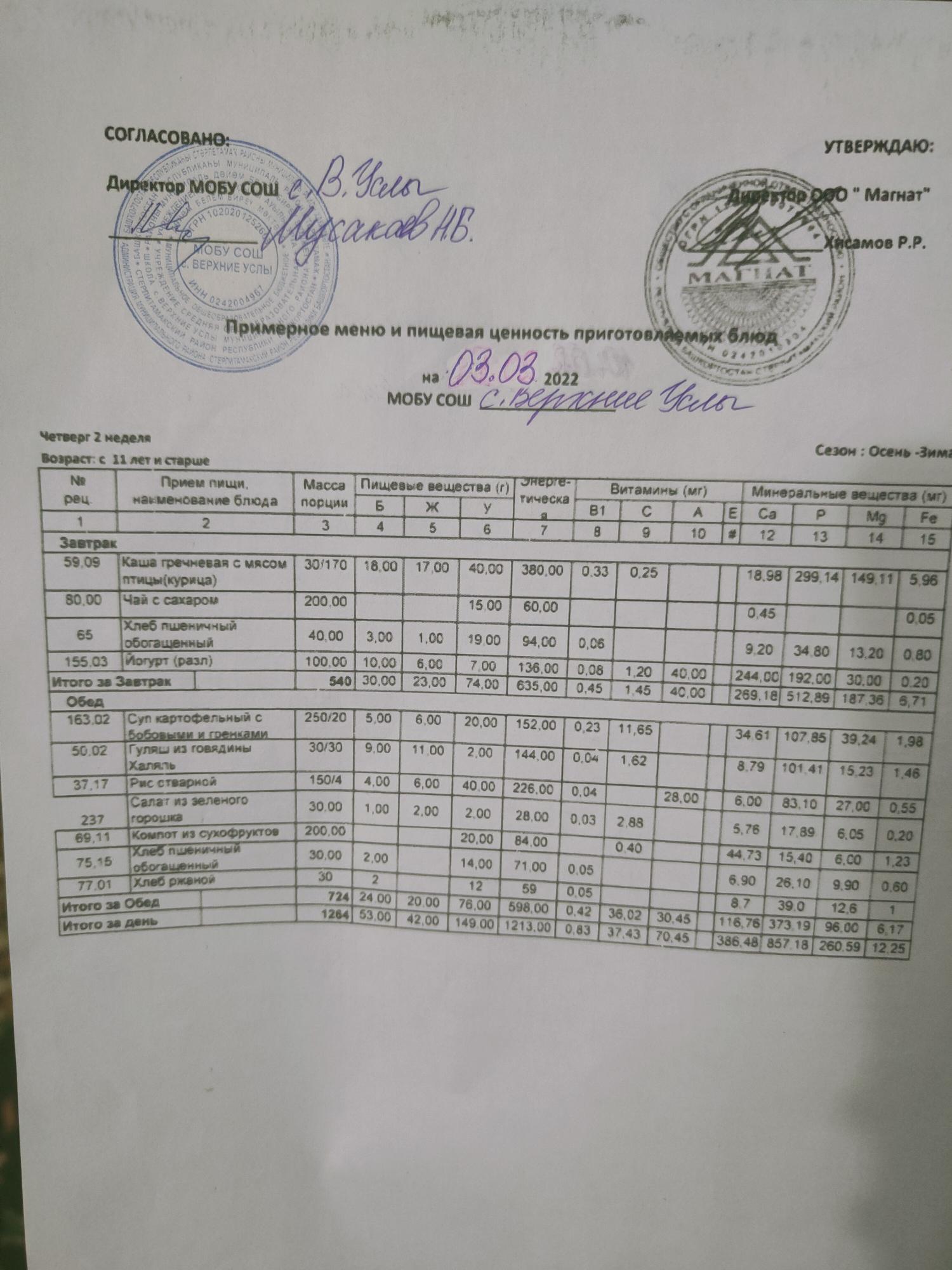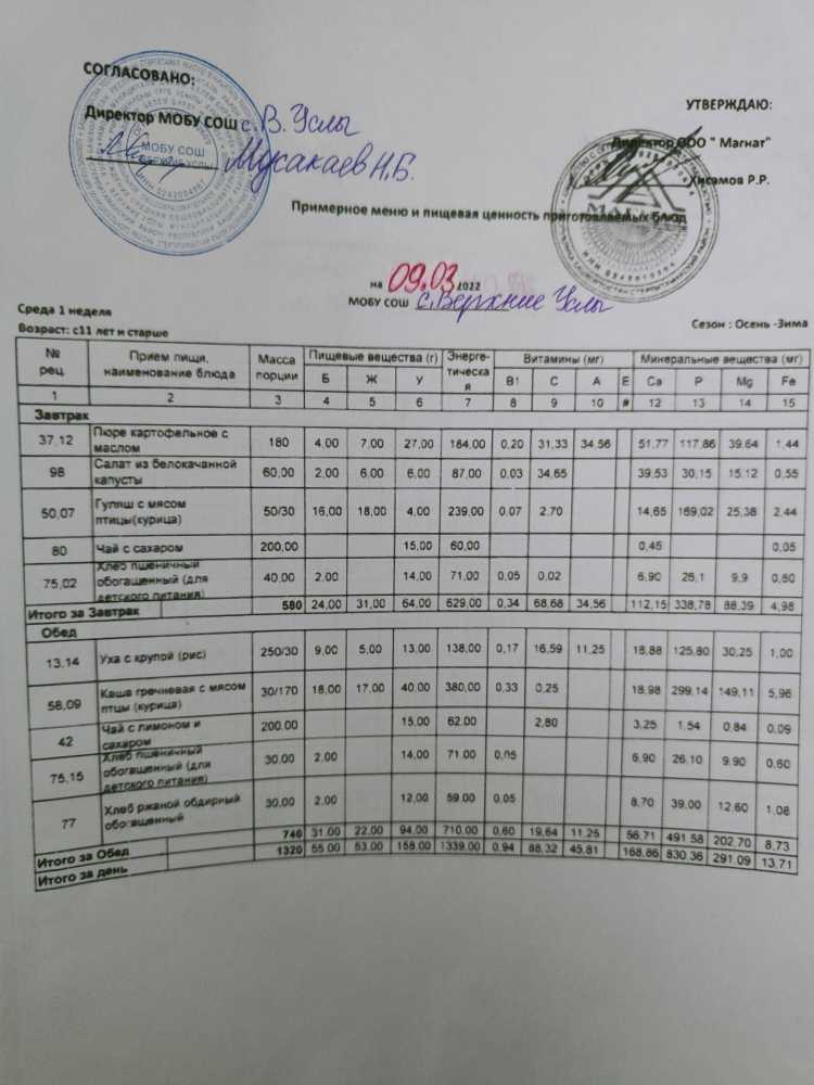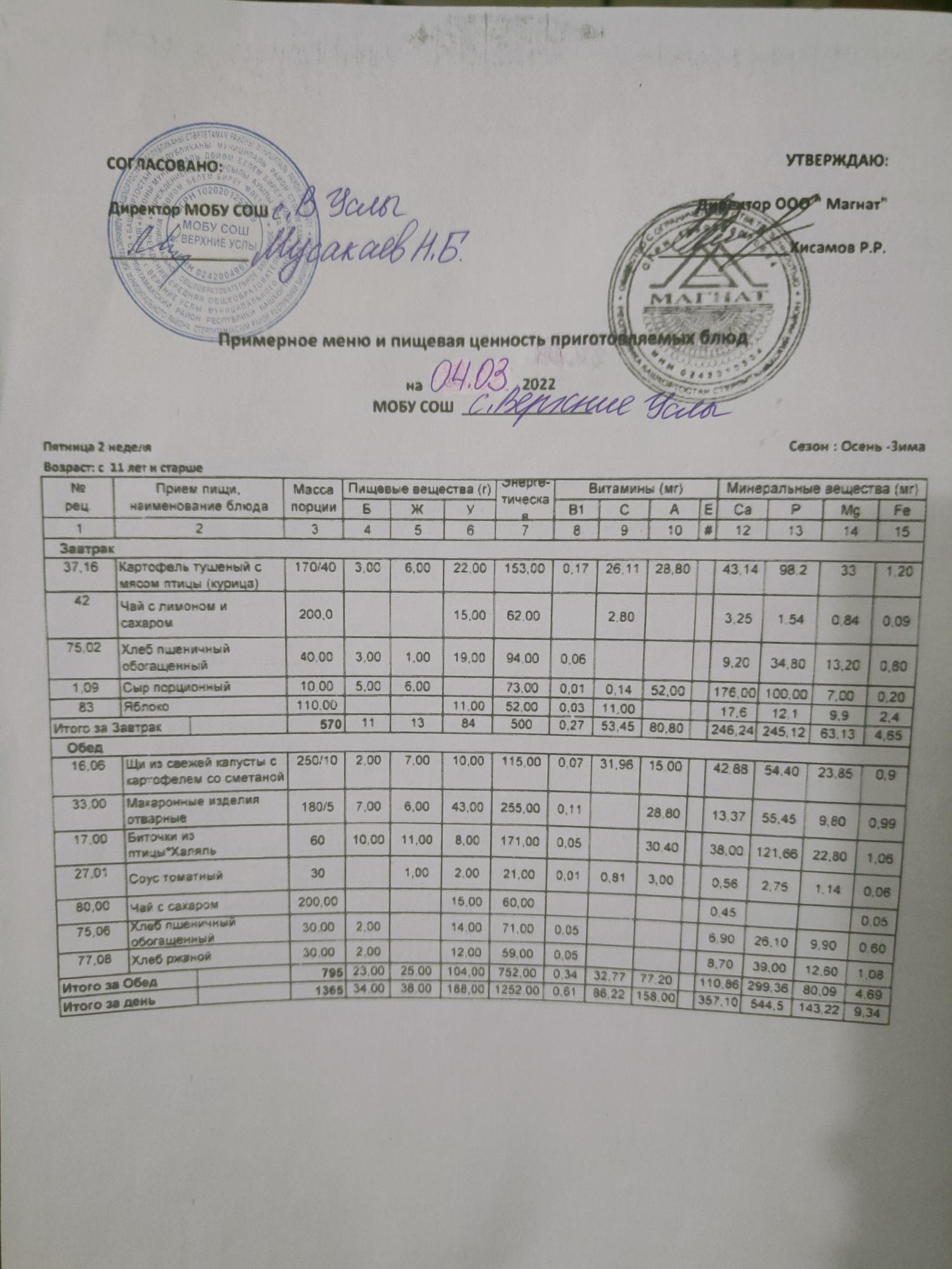 Меню дошкольной группы