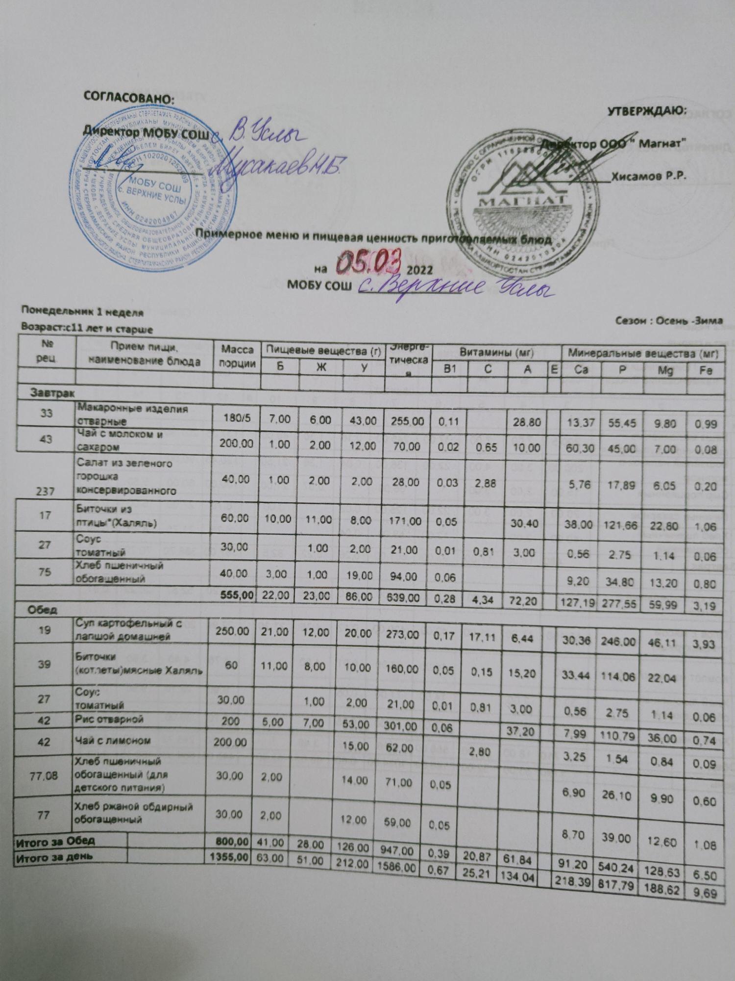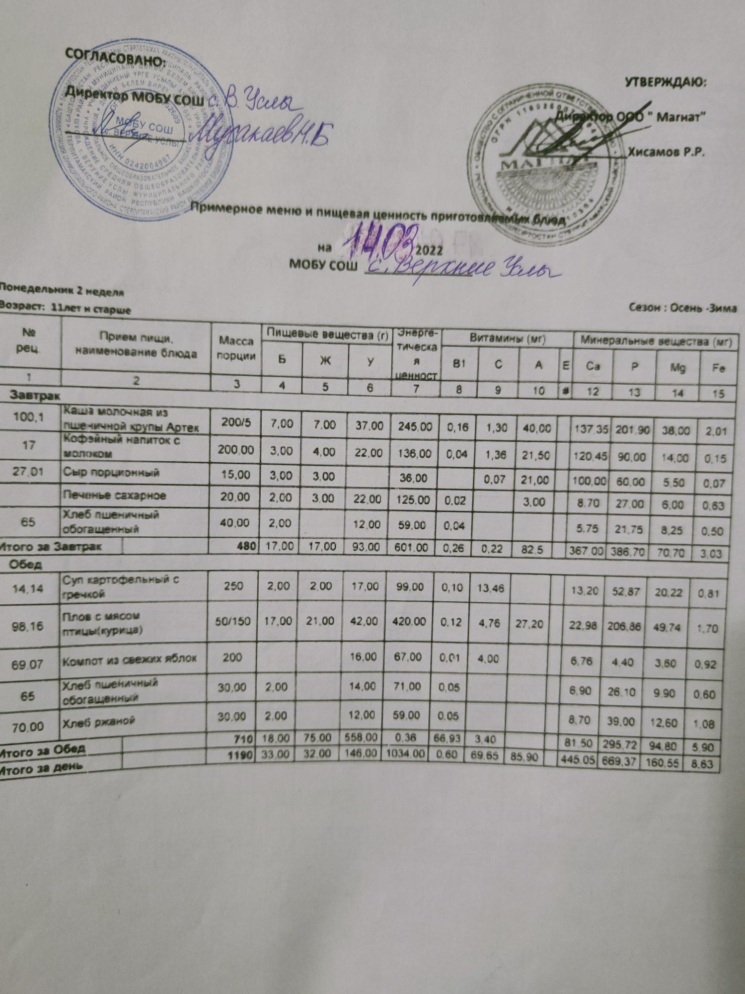 Стоимость школьного питания
