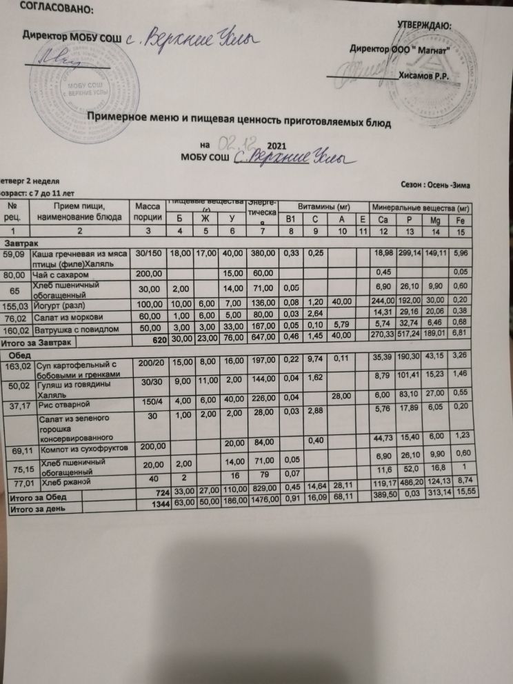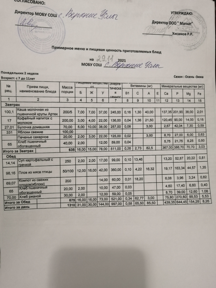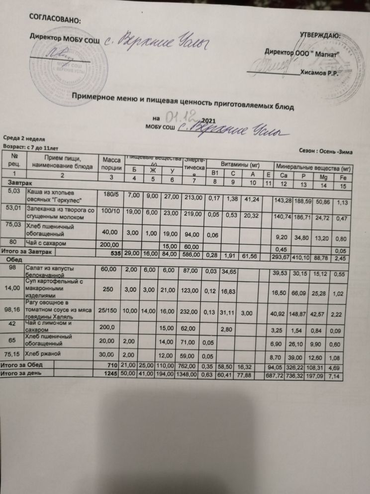 Меню дошкольной группы
