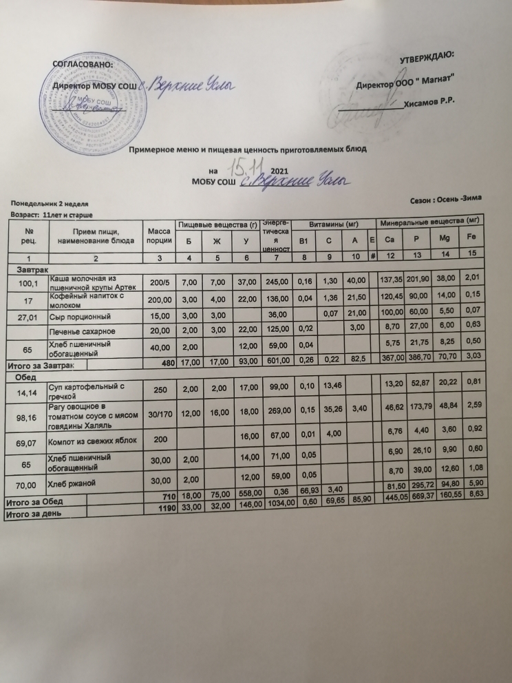 Меню дошкольной группы