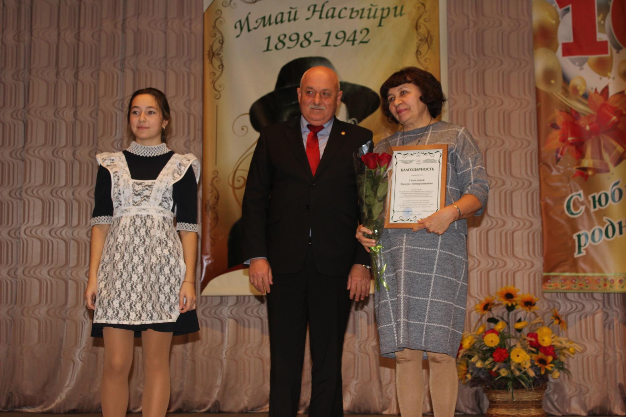 Подарок школе вручил и бывший директор школы Мунир Тимербаевич Маликов. Большая группа учителей была награждена Благодарственными письмами президиума районного Совета, Администрации района, районного отдела образования. От имени коллектива педагогов и учащихся директор школы Н.Б.Мусакаев выразил всем собравшимся благодарность.